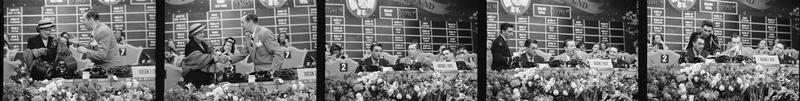 Milton Berle - Damon Runyon Cancer Fund [Man perfoming at the telethon and Milton Berle with guests at the telethon.]