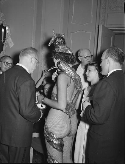 Art Students League Ball [Costumed men in restroom and partygoer in an elaborate costume.]