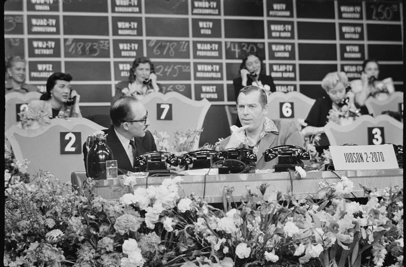 Milton Berle - Damon Runyon Cancer Fund [Milton Berle and another man answering phones at the telethon.]