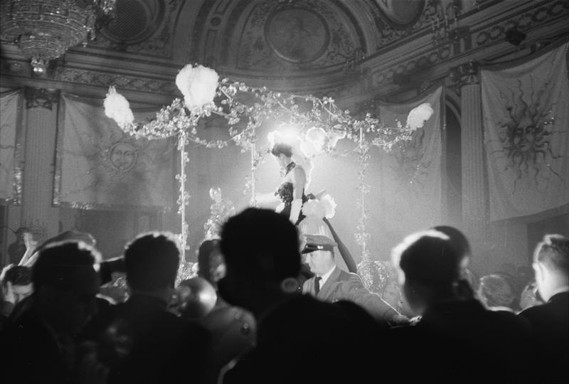 Art Students League Ball [Rita Gam on stage and costumed partygoers.]