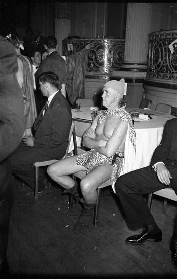 Art Students League Ball [Costumed man walking past men in tuxedoes.]