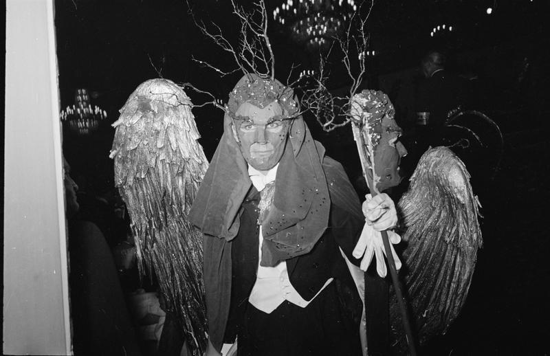 Art Students League Ball [Costumed woman walking down stairs and an elaborately costumed man posing with people.]