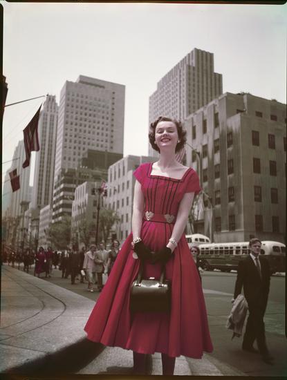 Fifth Avenue - Brigida Dammes, Laraine Day, Pat Geoghegan, Mary Damon. [Woman modeling on the sidewalk.]