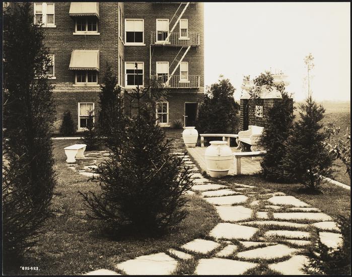 [Hawthorne Court. Apartment buildings and garden with women.]