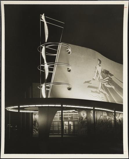 [Night view of the Production and Distribution building, New York World's Fair.]