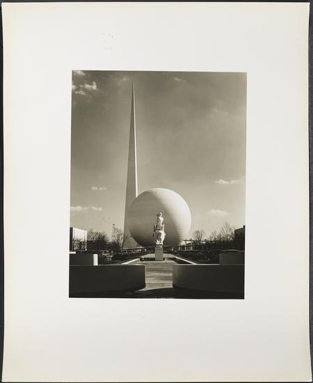 New York Worlds Fair. Theme Center, [Trylon and Perisphere],"Speed" statue
