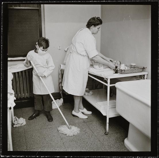 Orphanage [Nurse changing a diaper while a boy sweeps.]