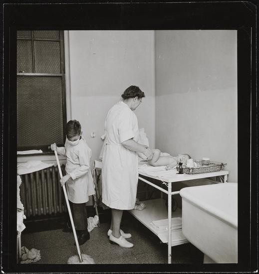 Orphanage [Nurse changing a diaper while a boy sweeps.]