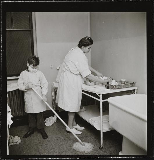 Orphanage [Nurse changing a diaper while a boy sweeps.]