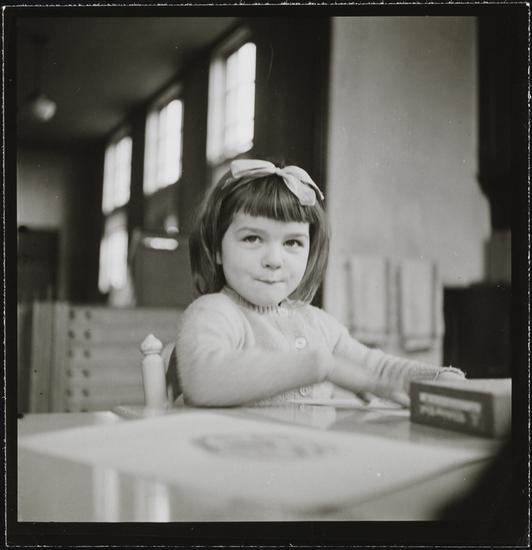 Orphanage [Girl sitting in an overturned baby carriage.]