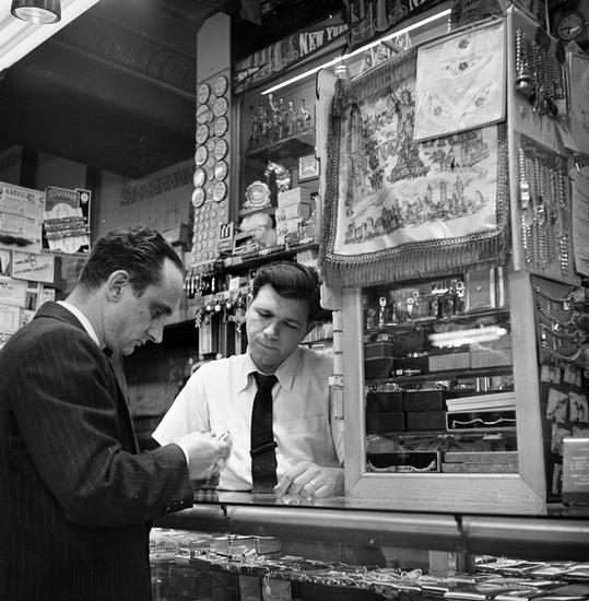 All Around the Town - Miscellaneous New York City Scenes [Men shopping at a souvenir shop on 42nd Street.]