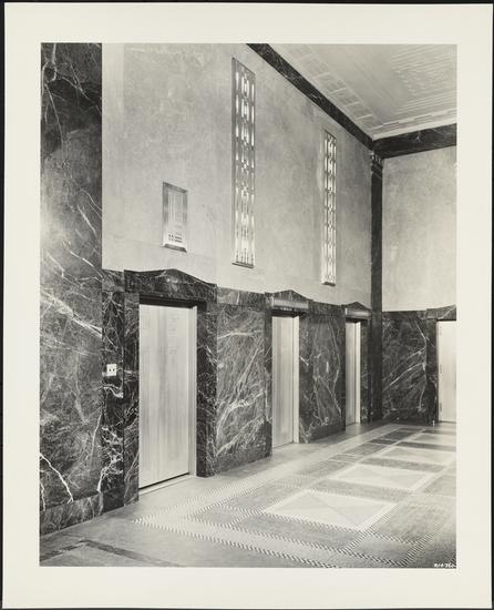 Pine Street. Goldman-Sachs Building. Interior, elevator lobby