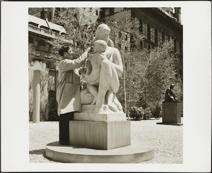 11 West 53rd Street. Museum of Modern Art. Rear sculpture garden. William Zorach at work on "Mother and Child" sculpture