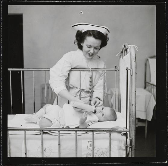 Orphanage [Nurse and a boy holding a stuffed animal.]