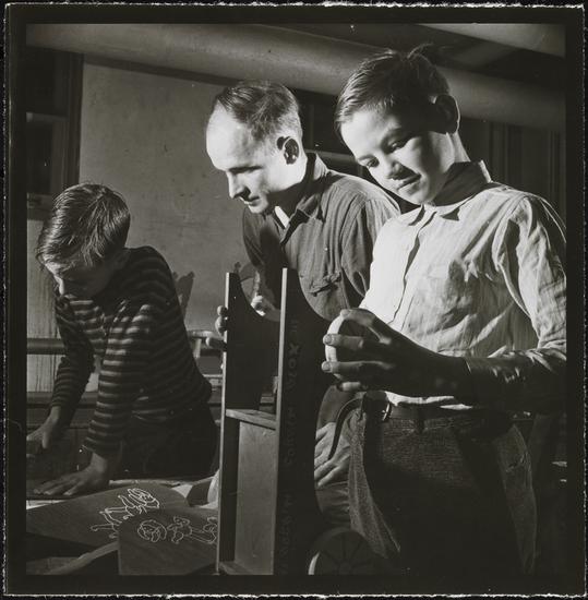 Orphanage [Man helping boys build a toy wagon.]