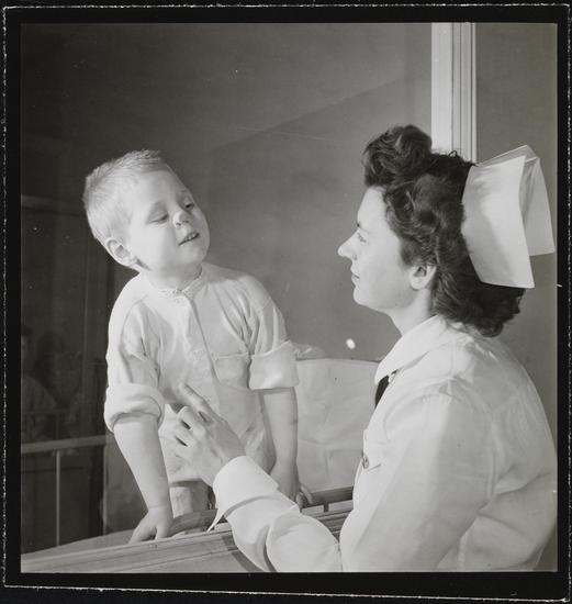 Orphanage [Nurse and a boy holding a stuffed animal.]
