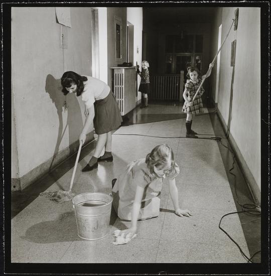 Orphanage [Girls cleaning a hallway.]