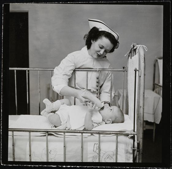 Orphanage [Nurse and a boy holding a stuffed animal.]