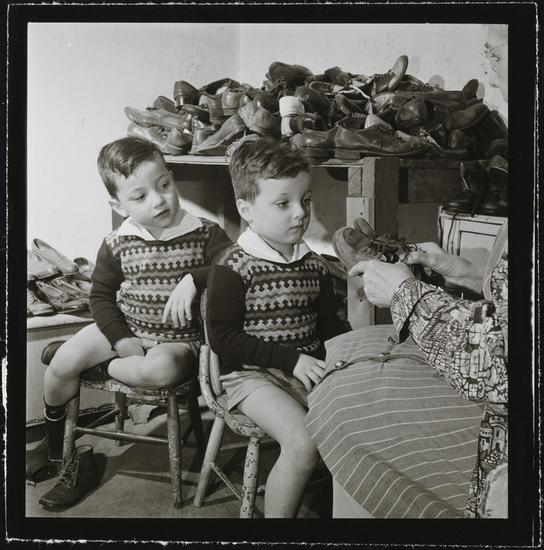Orphanage [Nurse changing a diaper while a boy sweeps.]