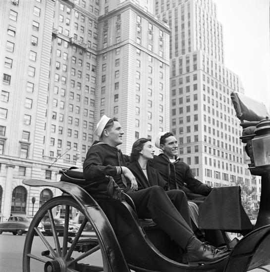 Hansom Cab [Two sailors and a woman in a horse-drawn carriage outisde the Plaza Hotel.]