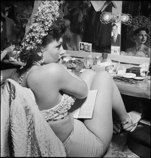 Night Clubs- Copa Showgirls [Showgirl reading backstage.]
