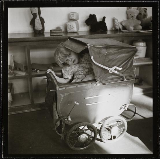 Orphanage [Girl sitting in an overturned baby carriage.]