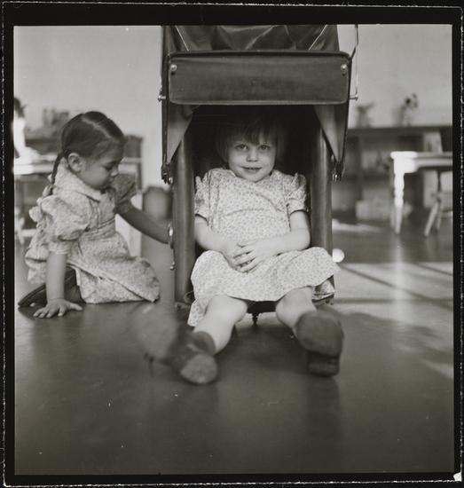 Orphanage [Girl sitting in an overturned baby carriage talking to a girl holding a stuffed animal.]