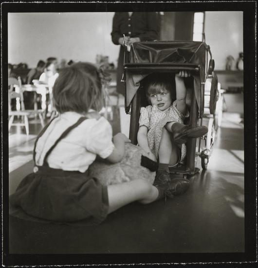 Orphanage [Girl sitting in an overturned baby carriage.]