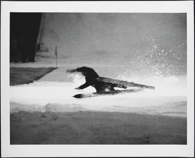 [Ski jumper falling in snow at North American Winter Sports Show.]