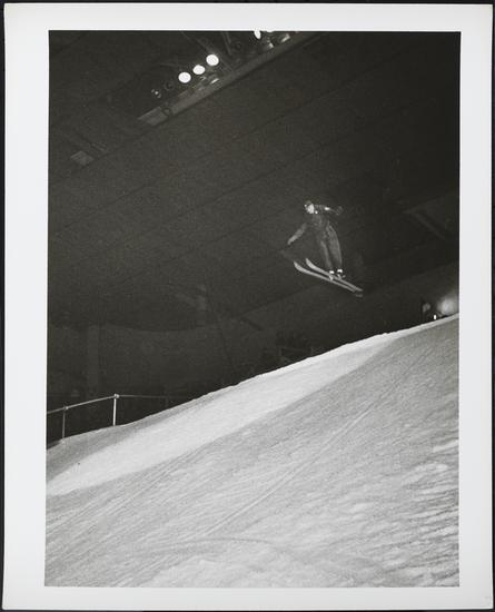 [Ski jumper falling in snow at North American Winter Sports Show.]
