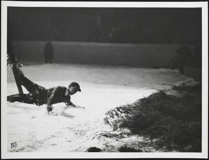 [Ski jumper falling in snow at North American Winter Sports Show.]