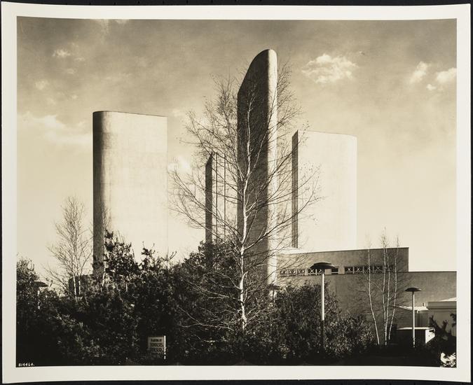 [Detail of the Gas Industries building at night, New York World's Fair.]