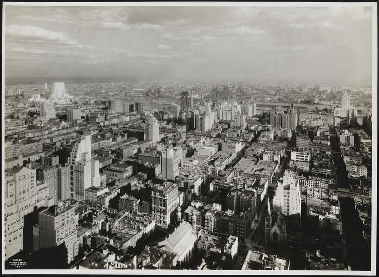 City view from 60 Wall [70 Pine Street] tower looking north up East River with Brooklyn Bridge, Manhattan Bridge and Williamsburg Bridge