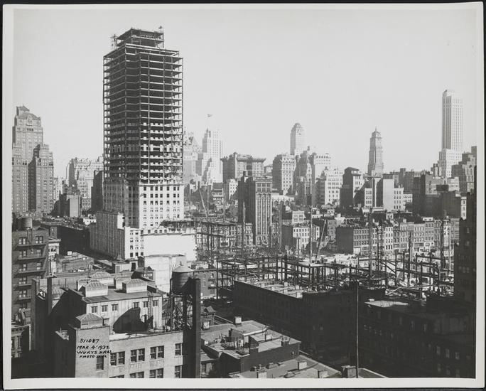 Rockefeller Center and Radio City Music Hall. Construction, steel frame. View from Goelet Building, 608 Fifth Avenue
