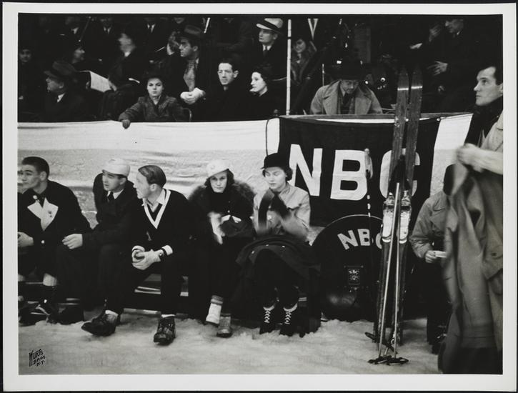 [Skiers ascending a slope at North American Winter Sports Show.]