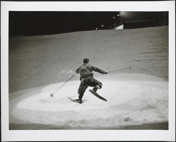 [Ski jumper falling in snow at North American Winter Sports Show.]