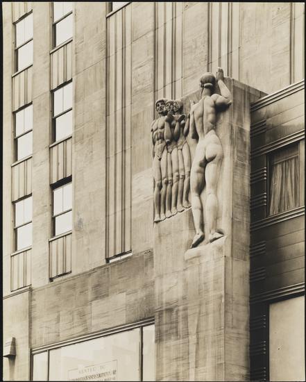 ["The Spirit of Progress" limestone panel by Gaston Lachaise on the entrance pier of the RCA Building West.]