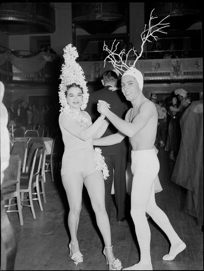 Art Students League of New York "Dream Ball" [Couple with ornate headpieces dancing at the ball.]