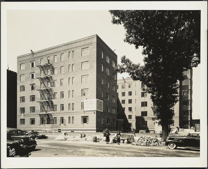 Bowne Avenue. Bowne Apartments, courtyard and entrance detail.