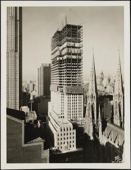 Rockefeller Center and Radio City Music Hall. Construction, steel frame. View from Goelet Building, 608 Fifth Avenue