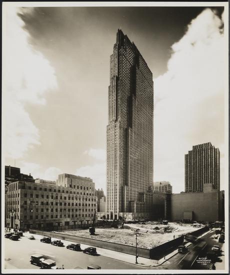 Rockefeller Center and Radio City Music Hall. Construction, steel frame. View from Goelet Building, 608 Fifth Avenue