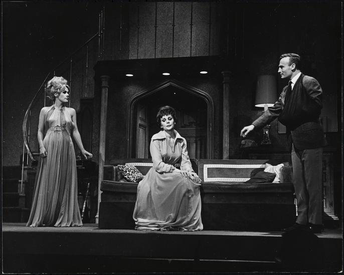 [Louise Troy as Ruth Condomine, Edward Woodward as Charles Condomine, and Tammy Grimes as Elvira in "High Spirits".]