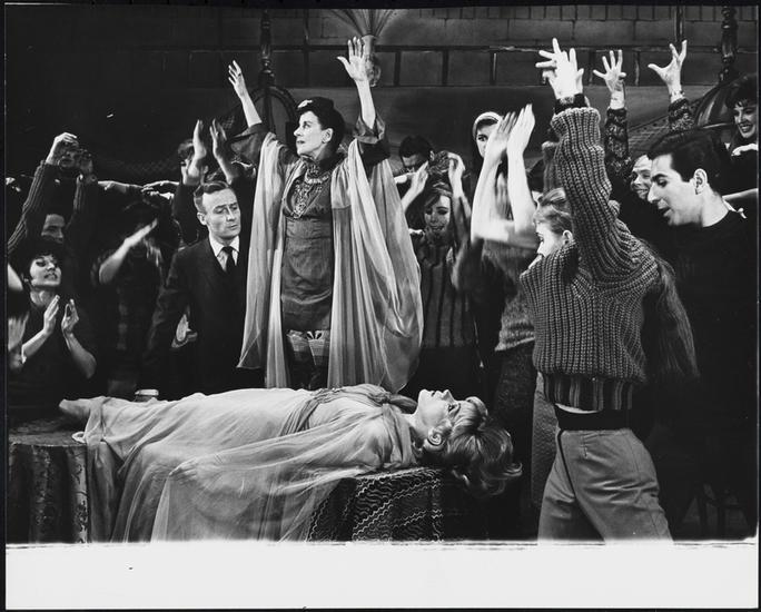 [Tammy Grimes as Elvira, Beatrice Lillie as Madame Arcati, and Edward Woodward as Charles Condomine in "High Spirits".]