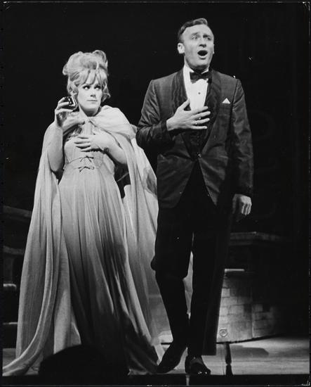 [Louise Troy as Ruth Condomine and Edward Woodward as Charles Condomine in "High Spirits".]