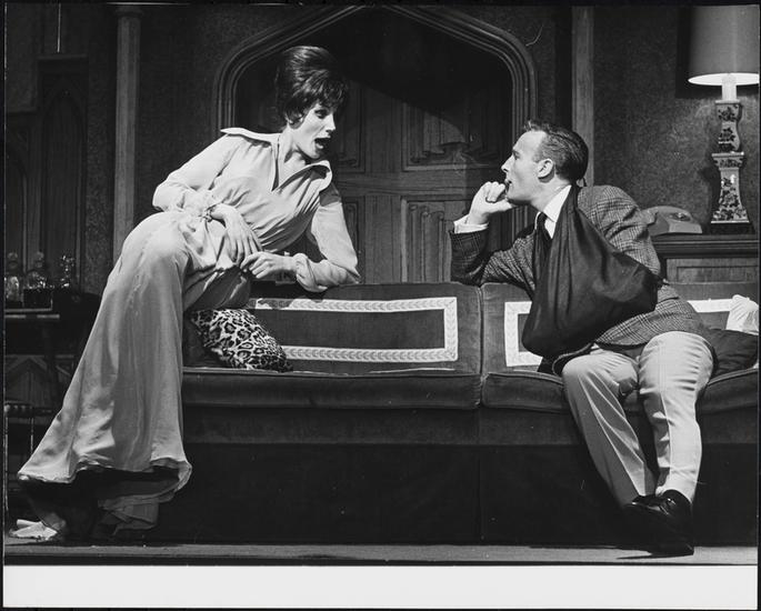 [Louise Troy as Ruth Condomine and Edward Woodward as Charles Condomine in "High Spirits".]