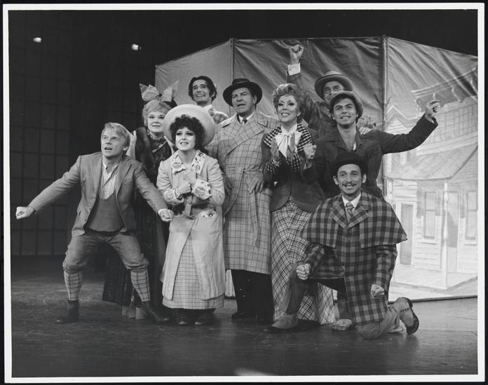[Lisa Kirk as Lottie Ames, Robert Preston as Mack Sennett and Bernadette Peters as Mabel Normand in "Mack & Mabel".]