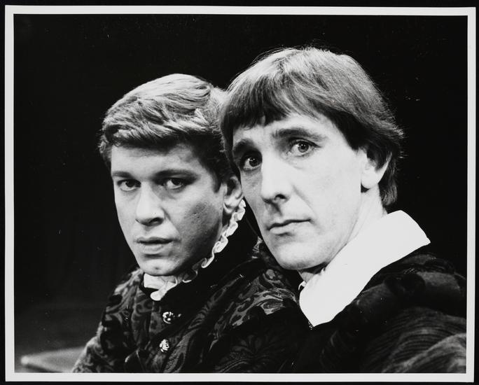 [Brian Murray as Rosencrantz, Noel Craig as Hamlet and John Wood as Guildenstern in "Rosencrantz and Guildenstern Are Dead".]