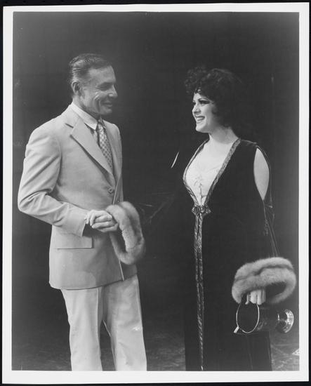 [James Mitchell as William Desmond Taylor and Bernadette Peters as Mabel Normand in "Mack & Mabel".]