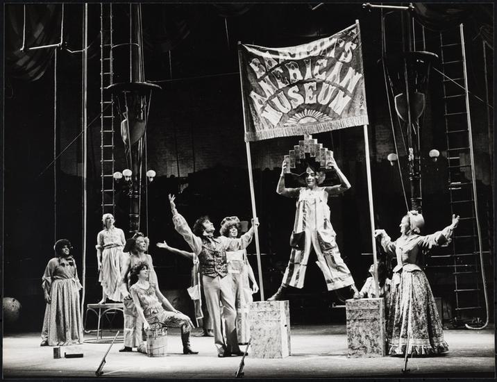 [Barbara Nadel as Lady Juggler, Edward T. Jacobs as Chief Bricklayer, Glenn Close as Mrs. Barnum and Jim Dale as the title role in "Barnum".]