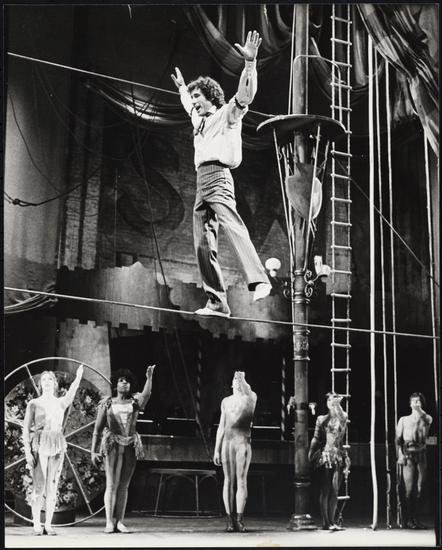 [Mike Burstyn as P. T. Barnum walking on a tightrope in "Barnum".]